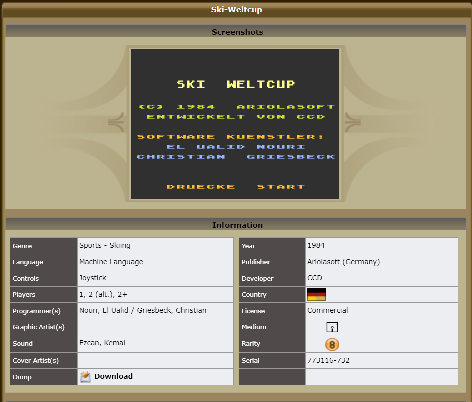 Hier die Abbuc PD Version (erhalten via ACE Newsletter), im Titel steht zuerst: "Ski Construction Set", danach folgt aber "Ski King II given by RED". Sieht mir irgendwie stark nach RK aus...