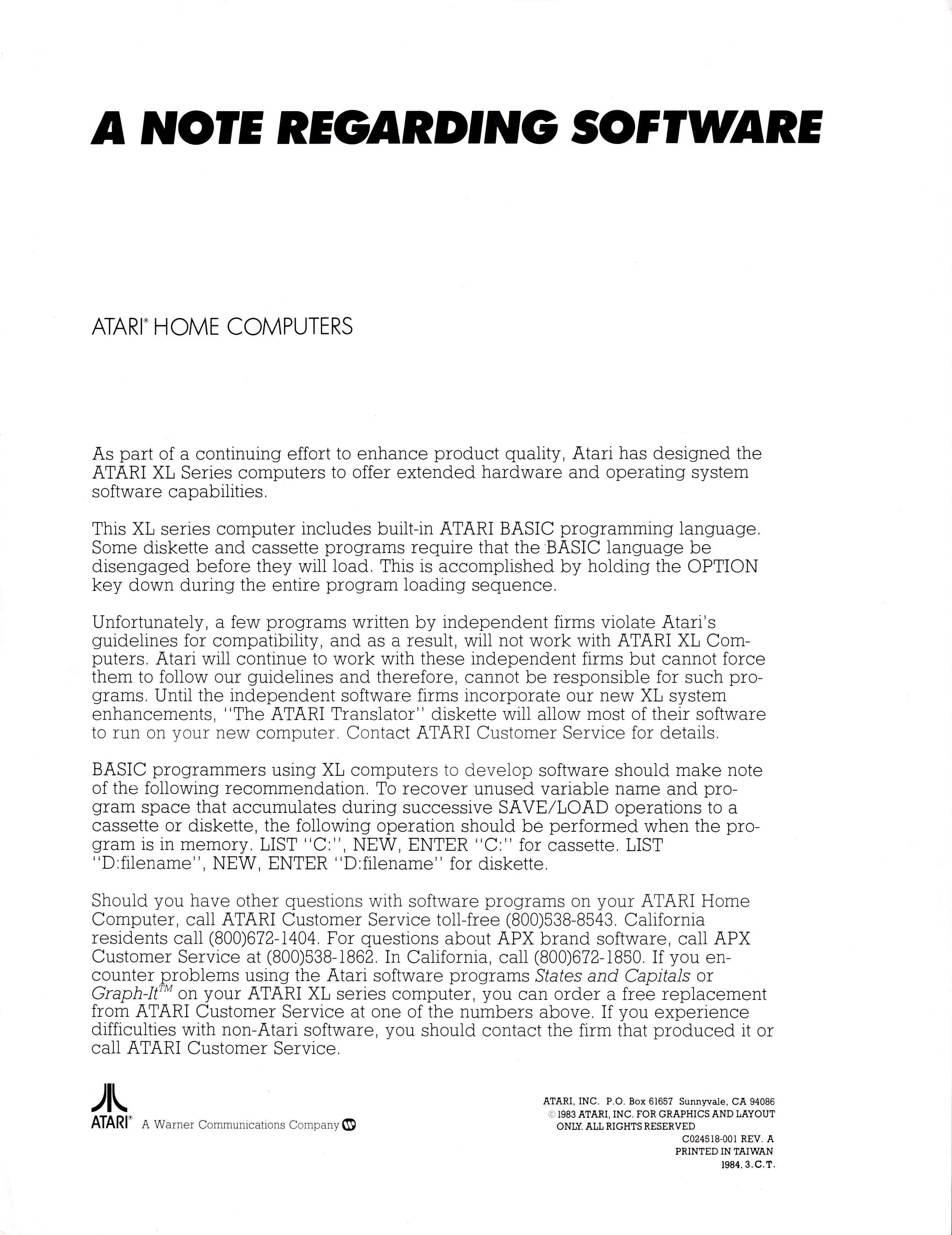 und direkt gescannt: Die "Warnung" von Atari bezüglich der Kompatibilität von Software auf den "neuen" XL-Computern.
