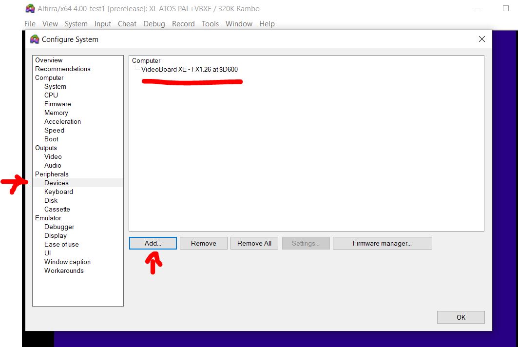 Du geht in Altirra auf: Configure System -> Devices -> Add und fügst dort das VBXE Board dazu.