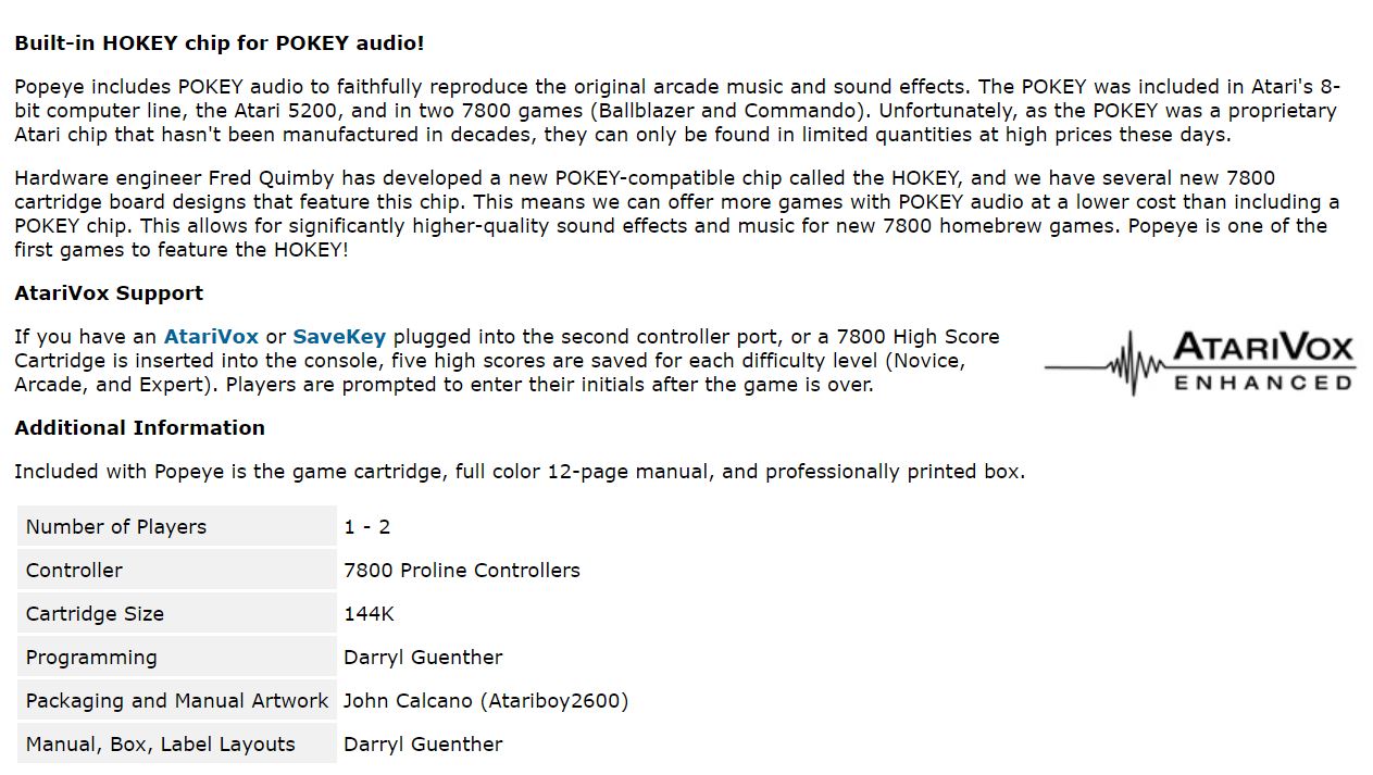 Auf Atari Age gibts Popeye für Atari 7800 in einer sehr schönen Retail-Version mit Manual und voller Pokey-Unterstützung (eingebauter Hokey).