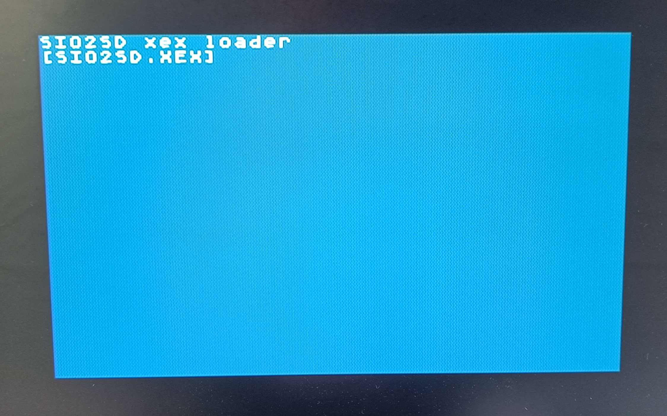 Dann habe ich mal mein SIO2SD angeschlossen und habe den Rechner eingeschaltet. Das SIO2SD lädt bis $30 (auf dem Bildschirm steht auch "SIO2SD xex loader [SIO2SD.XEX]") und dann sehe ich plötzlich nur noch diesen Bildschirm und weiter passiert nichts.