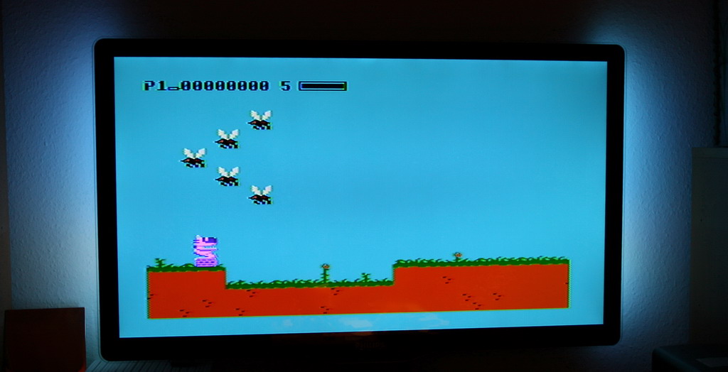 Das Bild vom Atari über S-Video wirkt quasi gestochen scharf. Allerdings hat das zur Folge, daß man diese senkrechten Pixelstreifen sieht, welche aber in Spielen nicht auffallen.
