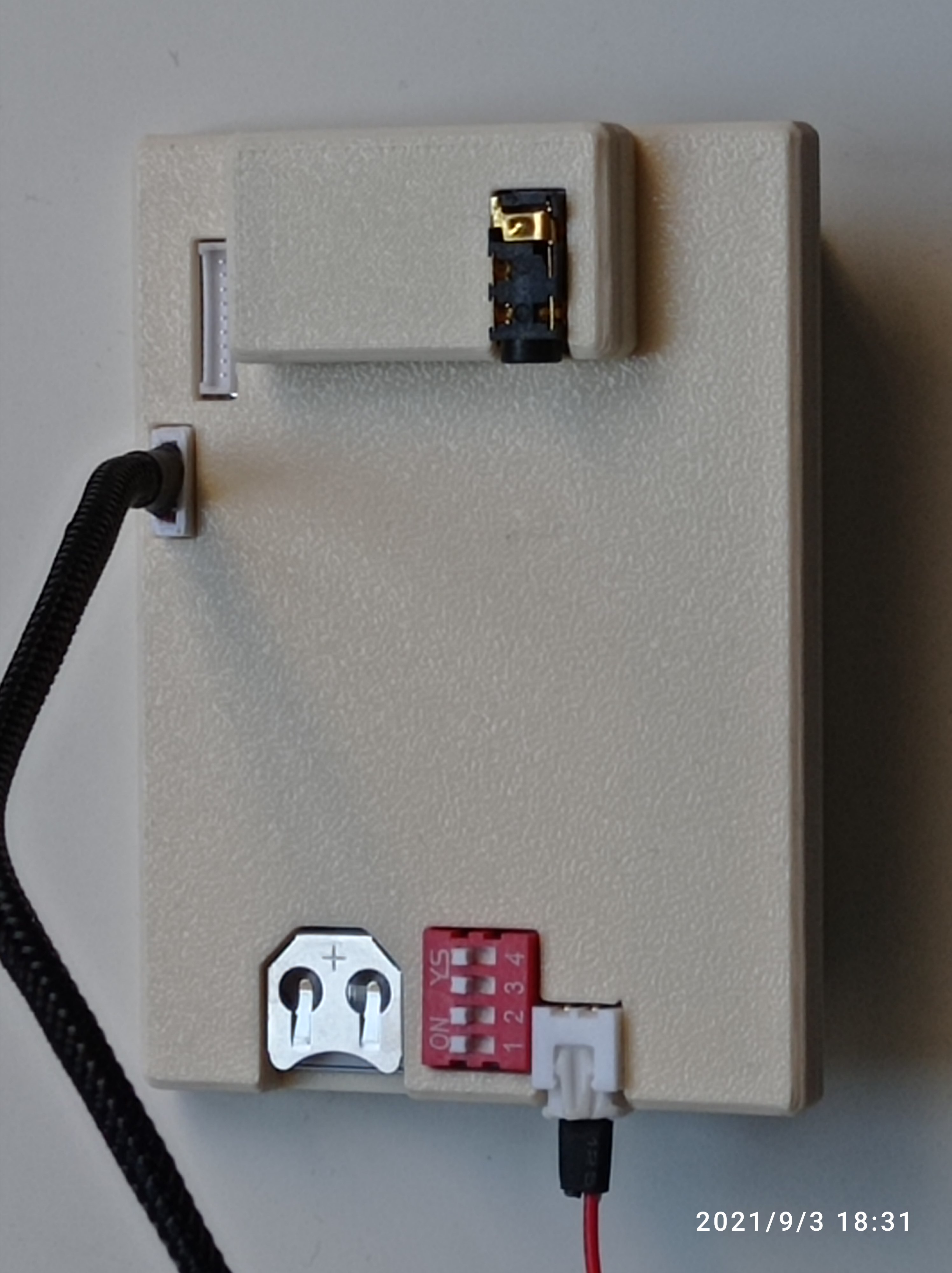 Die vier DIP Schalter haben noch keinerlei Funktion, unter dem silbernen Metall sitzt eine Batterie. Das kleine aufgesteckte Anhängsel ist die Covox Erweiterung mit Kopfhörer Ausgang.