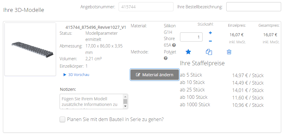 Aber theoretisch kann man die STL bei jedem besseren Druckservice drucken lassen. Ich habe als Material "Silikon G1H Shore 65A" genommen.