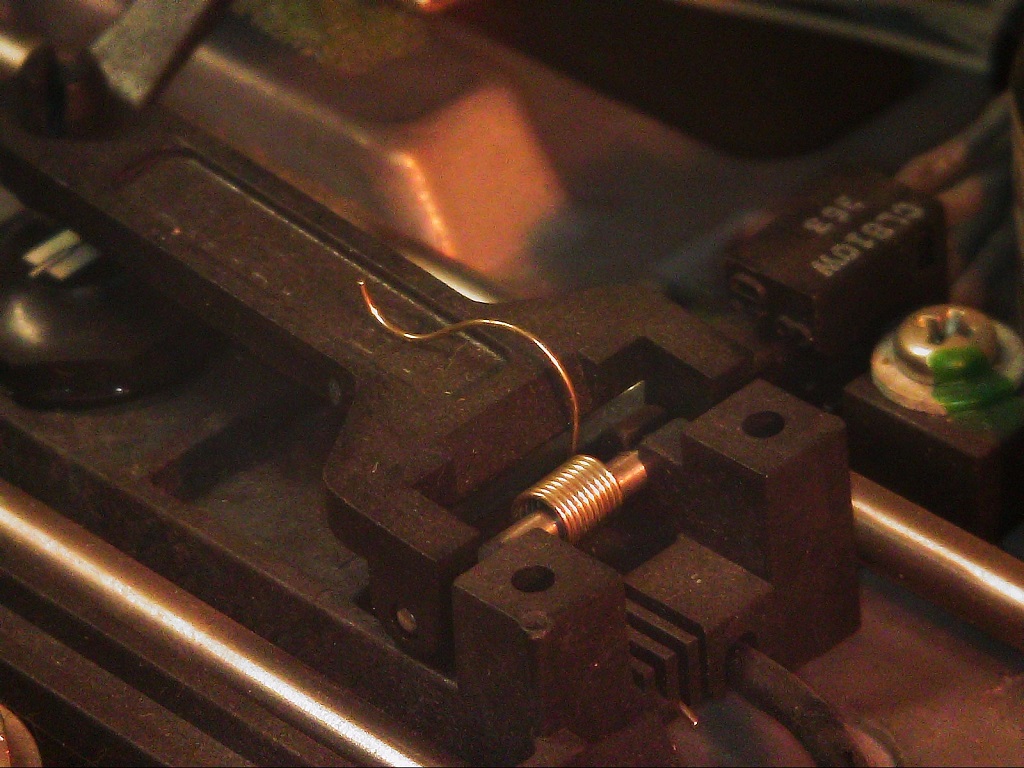 Der Arm mit dem Dorn ist an einem Federblech gelagert, welches als Schanier dient. Der Schreib/Lesekopf wird durch eine Feder gespannt: