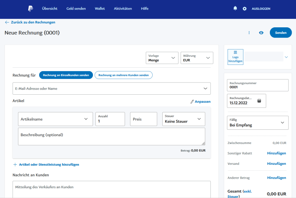 Rechnung schreiben geht übrigens tatsächlich direkt aus der Startseite über den "Mehr ..." Knopf rechts oben unter "Anfordern":