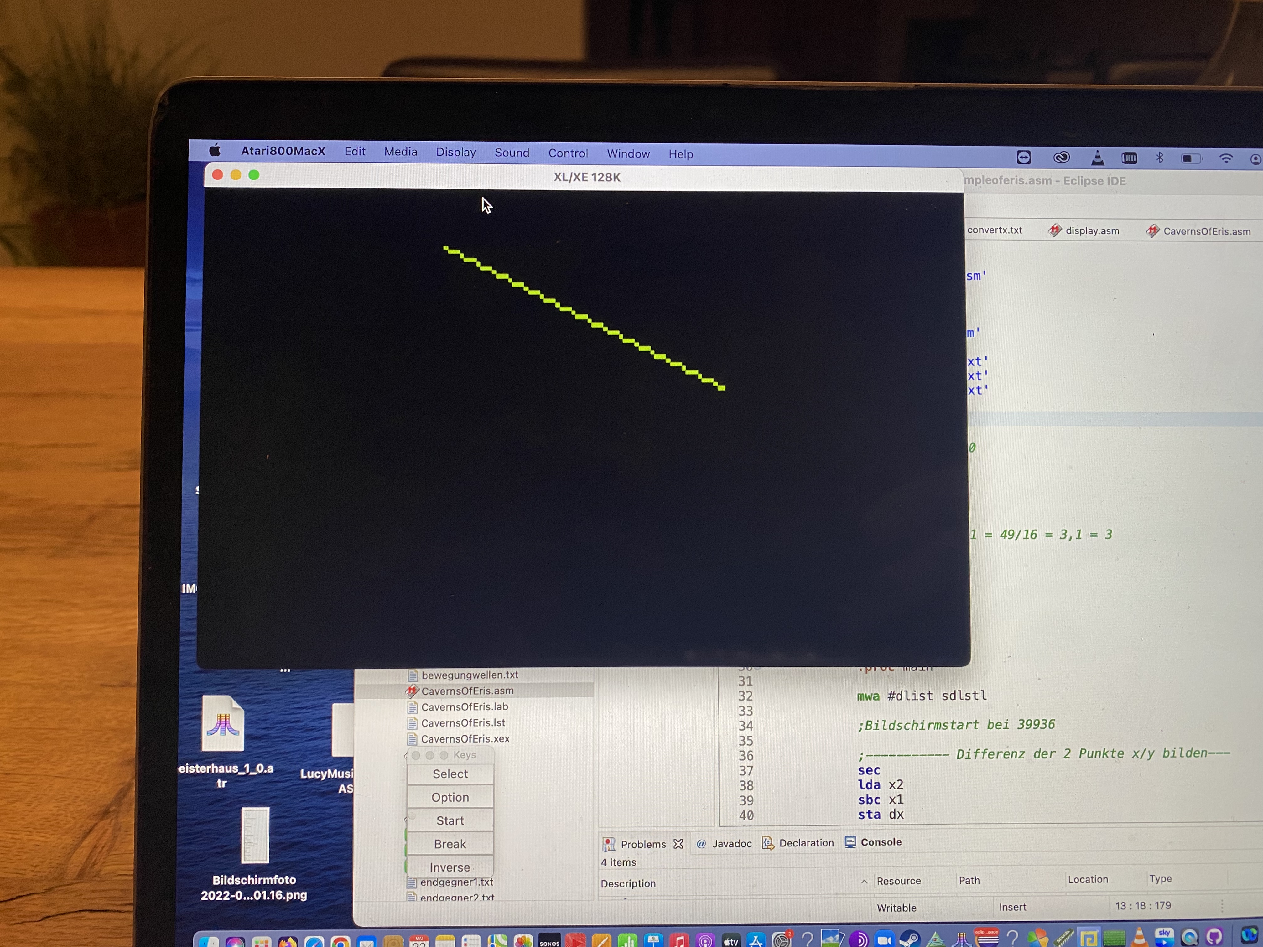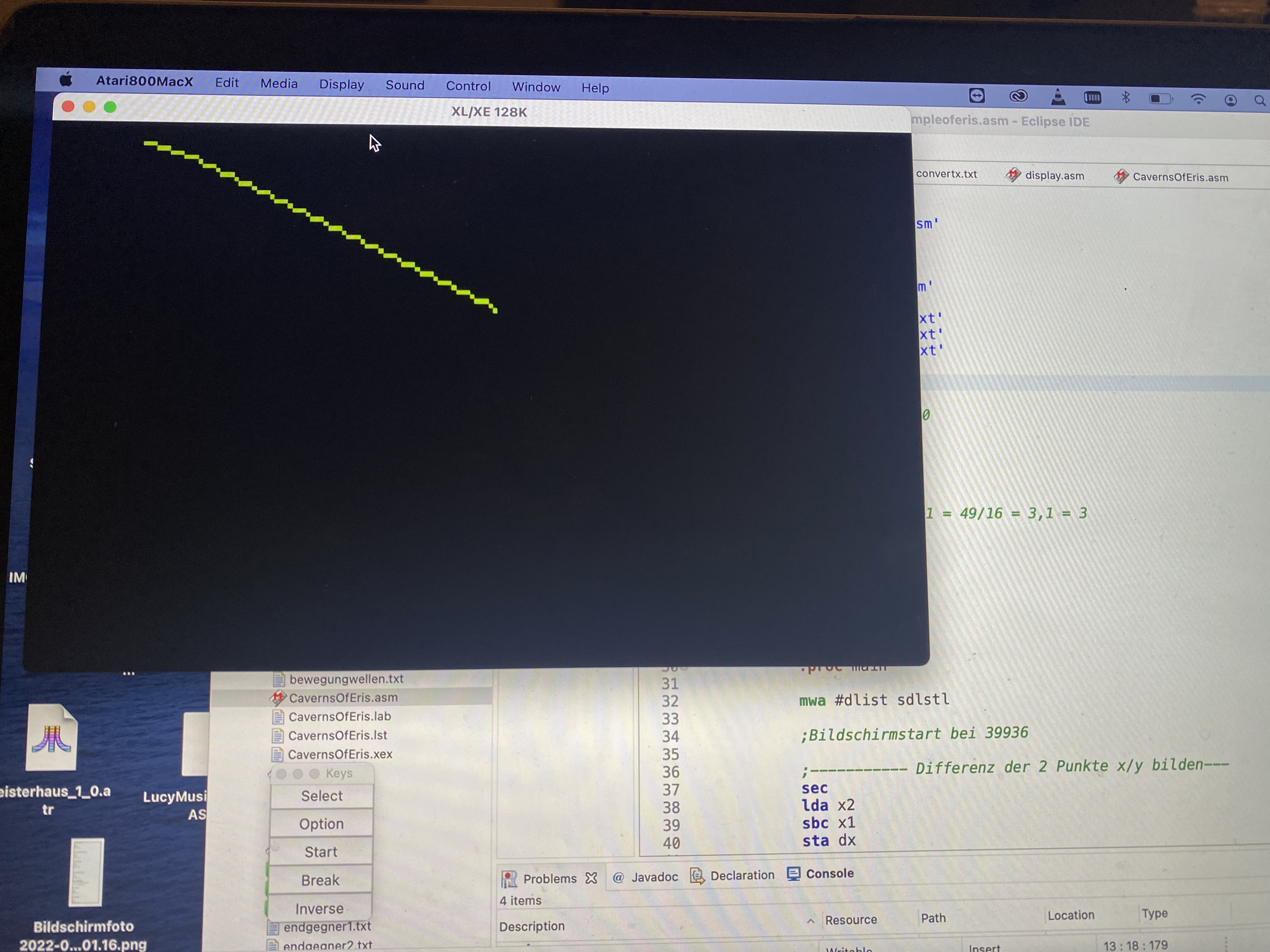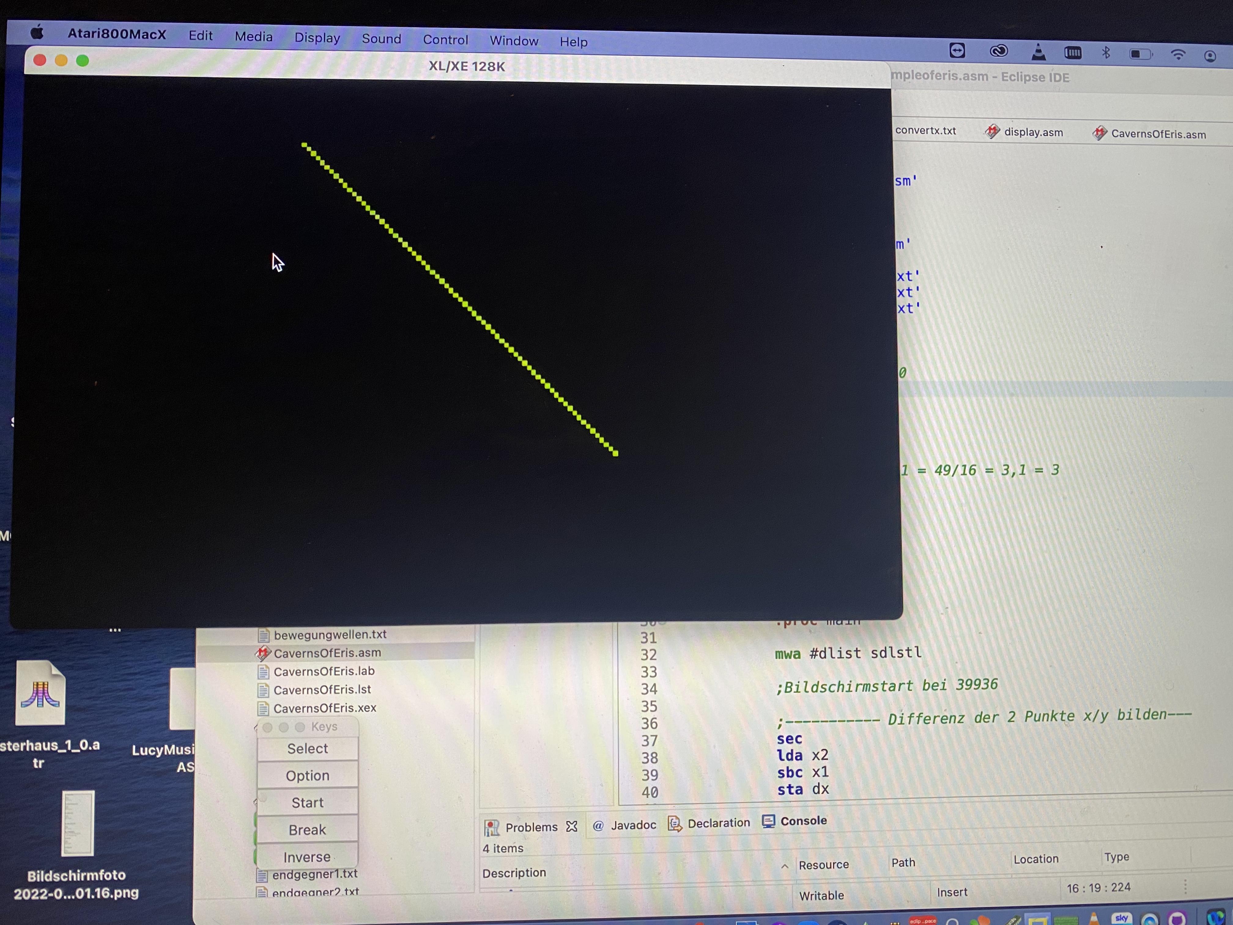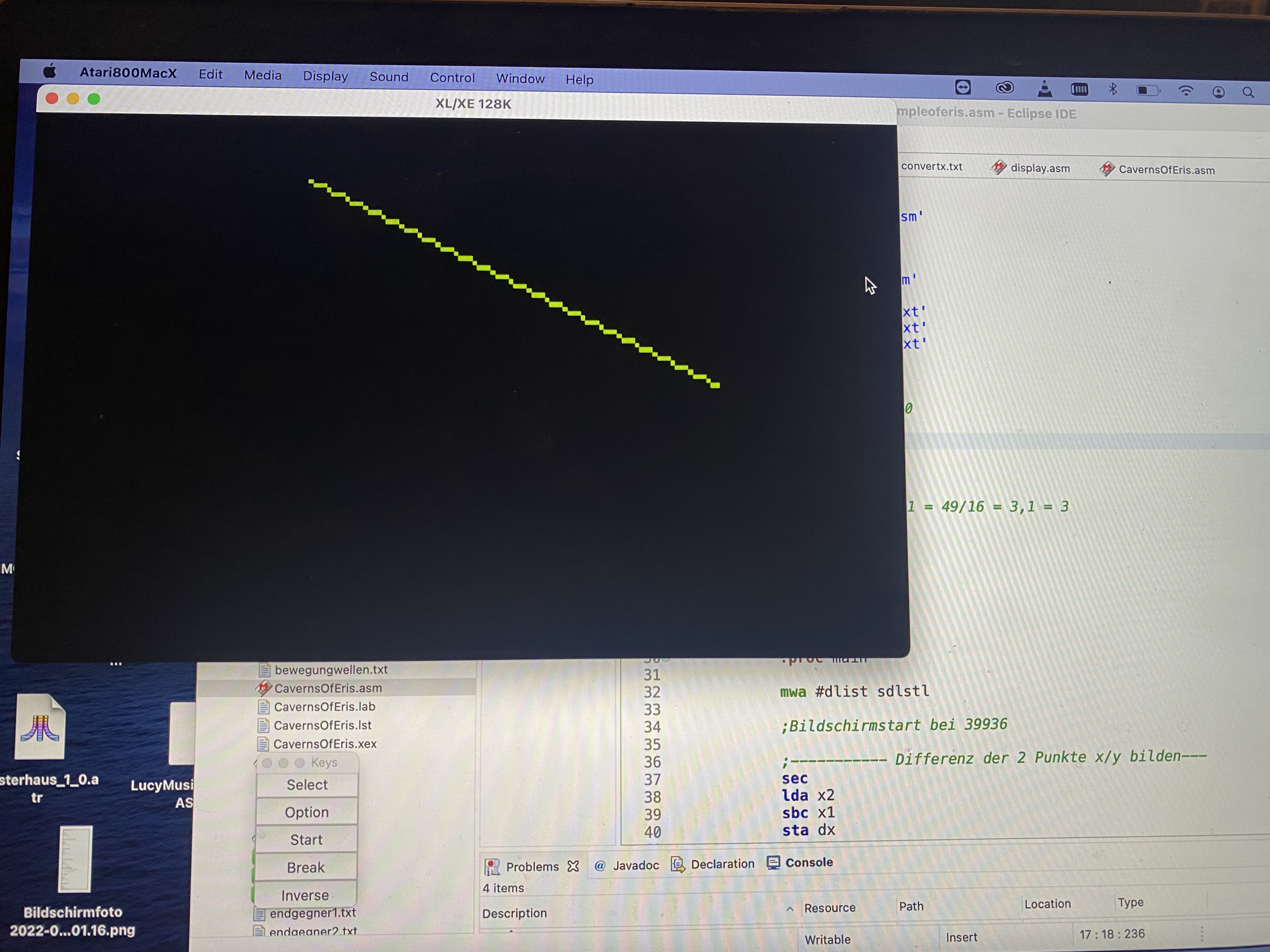 Wenn die Steigung z.B. 2.5 ist, bekommst Du für die "Unterschlagung" der Nachkommastellen mit Deiner Assemblerroutine "lustige" Ergebnisse...Dr. Irata hat geschrieben: ↑22.05.2023 20:38Ich muss ja zum zeichnen der Gerade nur einmal teilen - am Anfang - und danach setze ich nur noch die Pixel in Abhängigkeit der Steigung m.