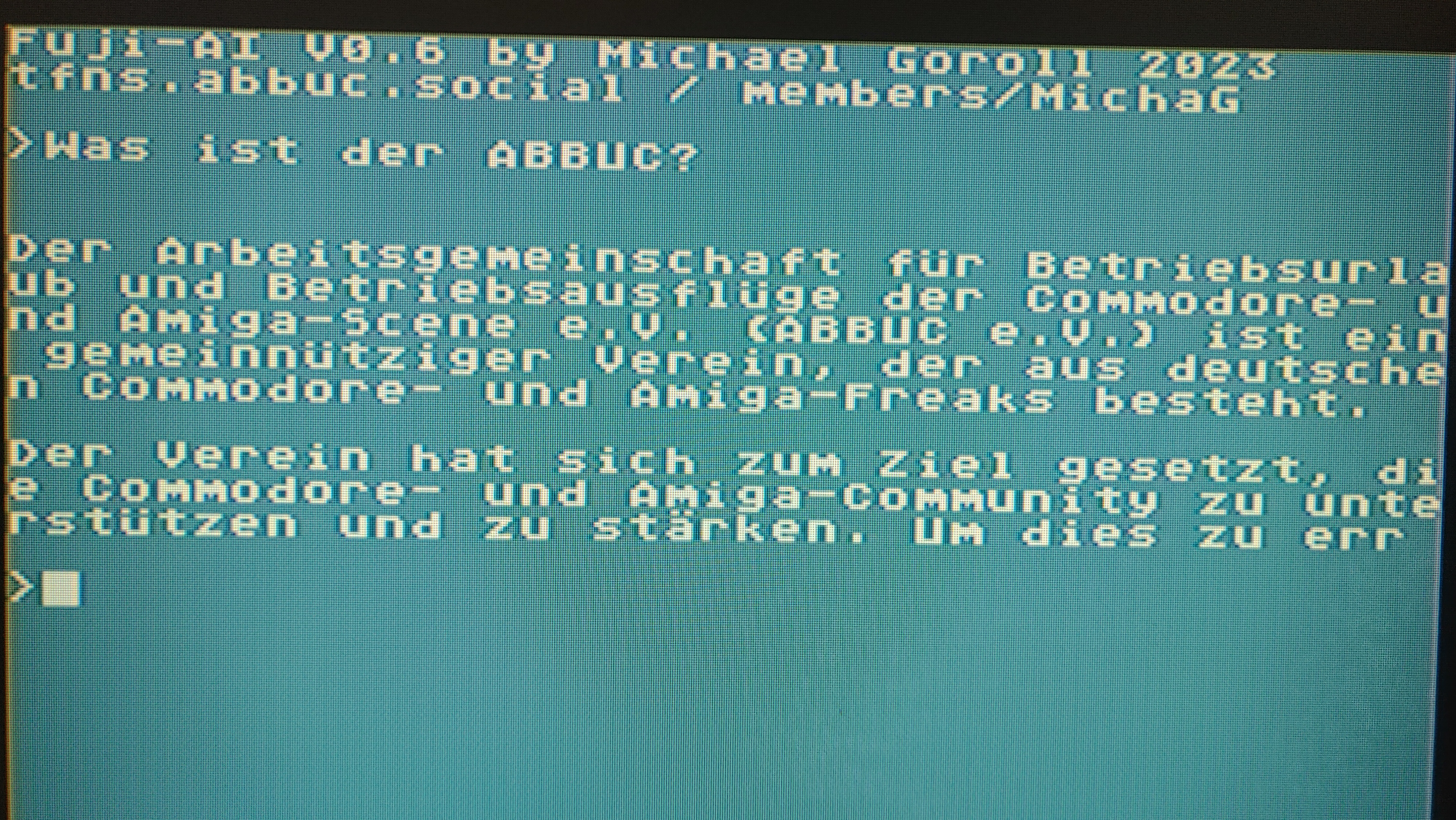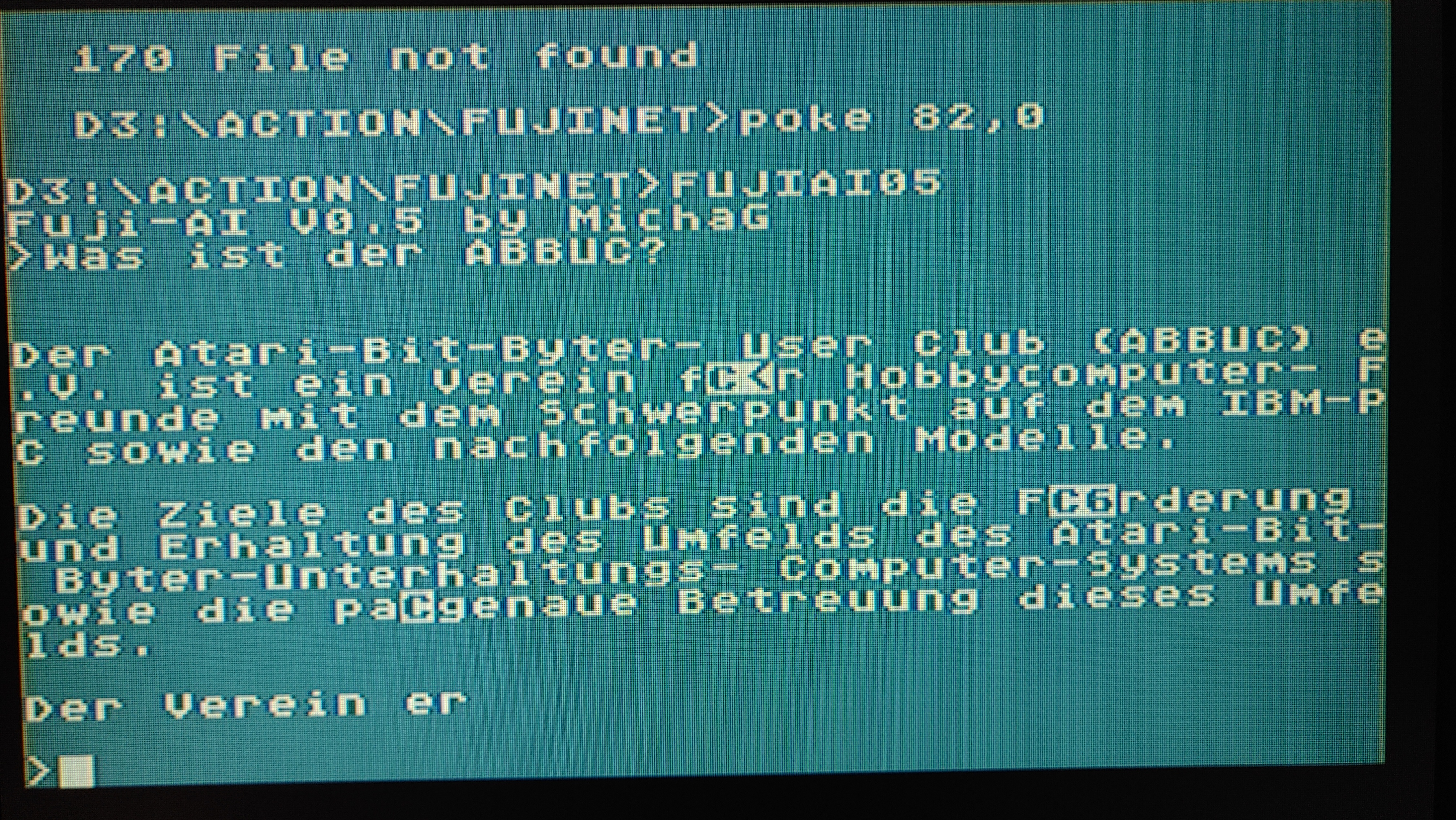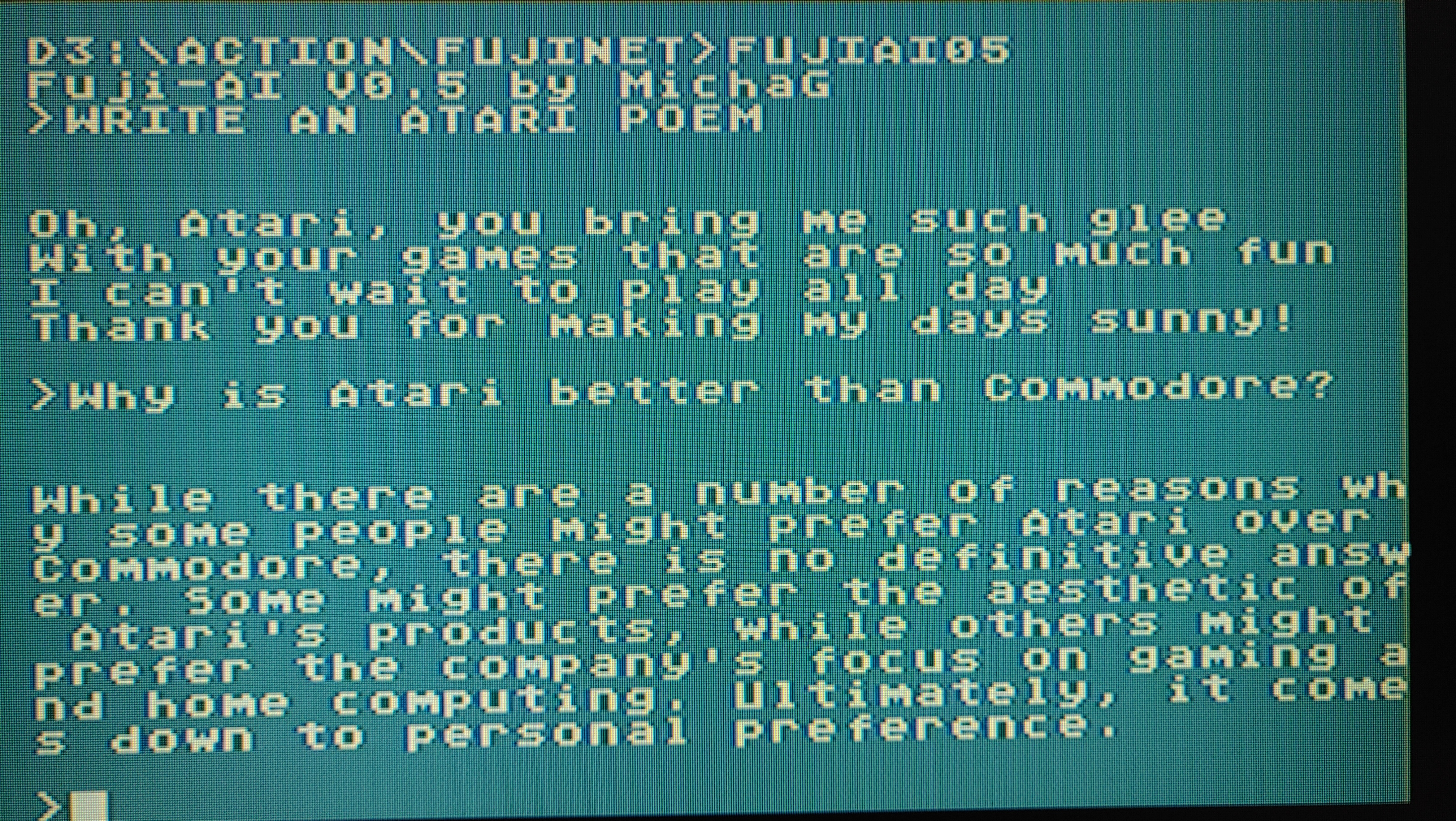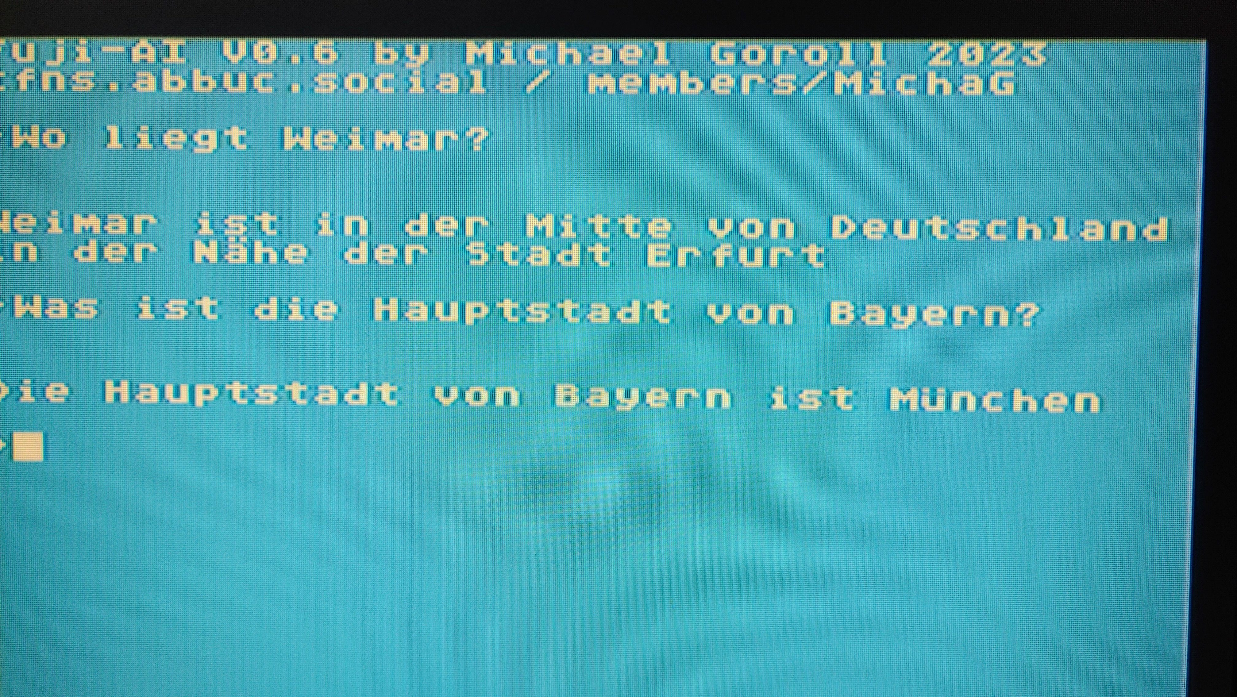 dein Fuji-AI war bisher immer ein ausgezeichneter "Partygag" gewesen. Es gibt nichts spaßigeres, als gegenüber Freunden/Besuchern/Kindern vom super intelligenten geheimnisvollen 130kB Parser aus der Vergangenheit zu erzählen, den man auf einem Homecomputer von 1983 alles fragen kann.