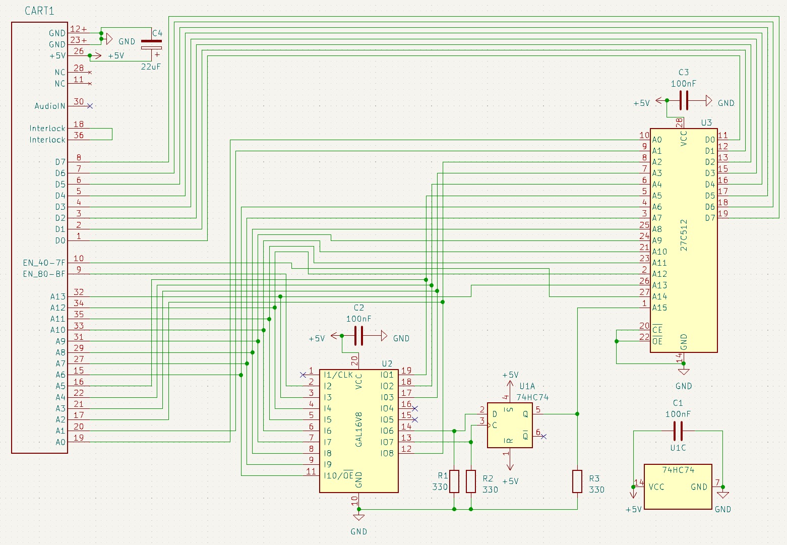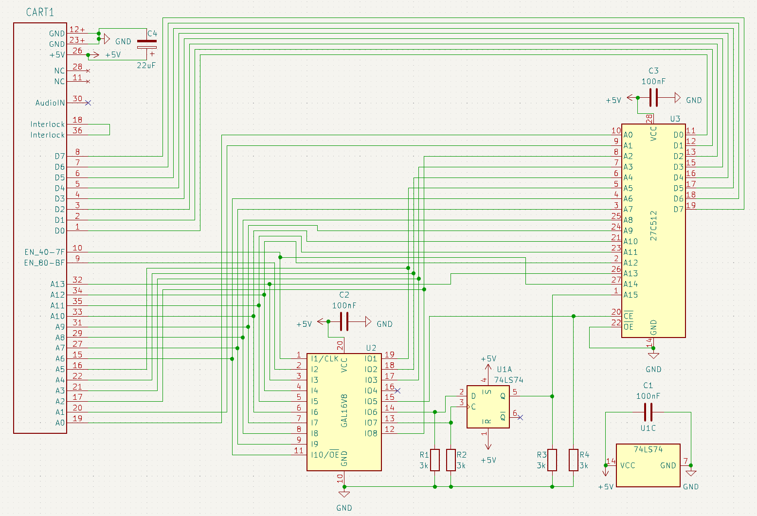 Ich würde es so machen wie alle anderen Bankswitching-Carts es auch machen. Der Bereich $8000-$BFFF bleibt immer statisch als "Main-Bank". Dort findet auch die Initialisierung und Umschaltung statt. Der Bereich $4000-$7FFF wird dann in drei Bänken umgeschaltet. Wenn Du dazu ein 22V10 verwendest anstelle eines 16V8, dann kann man das Ganze sehr fein ausdekodieren, so daß als "Umschalt-Adresse" z.B. $4000 allein ausreichend - man verliert nur ein Byte.
