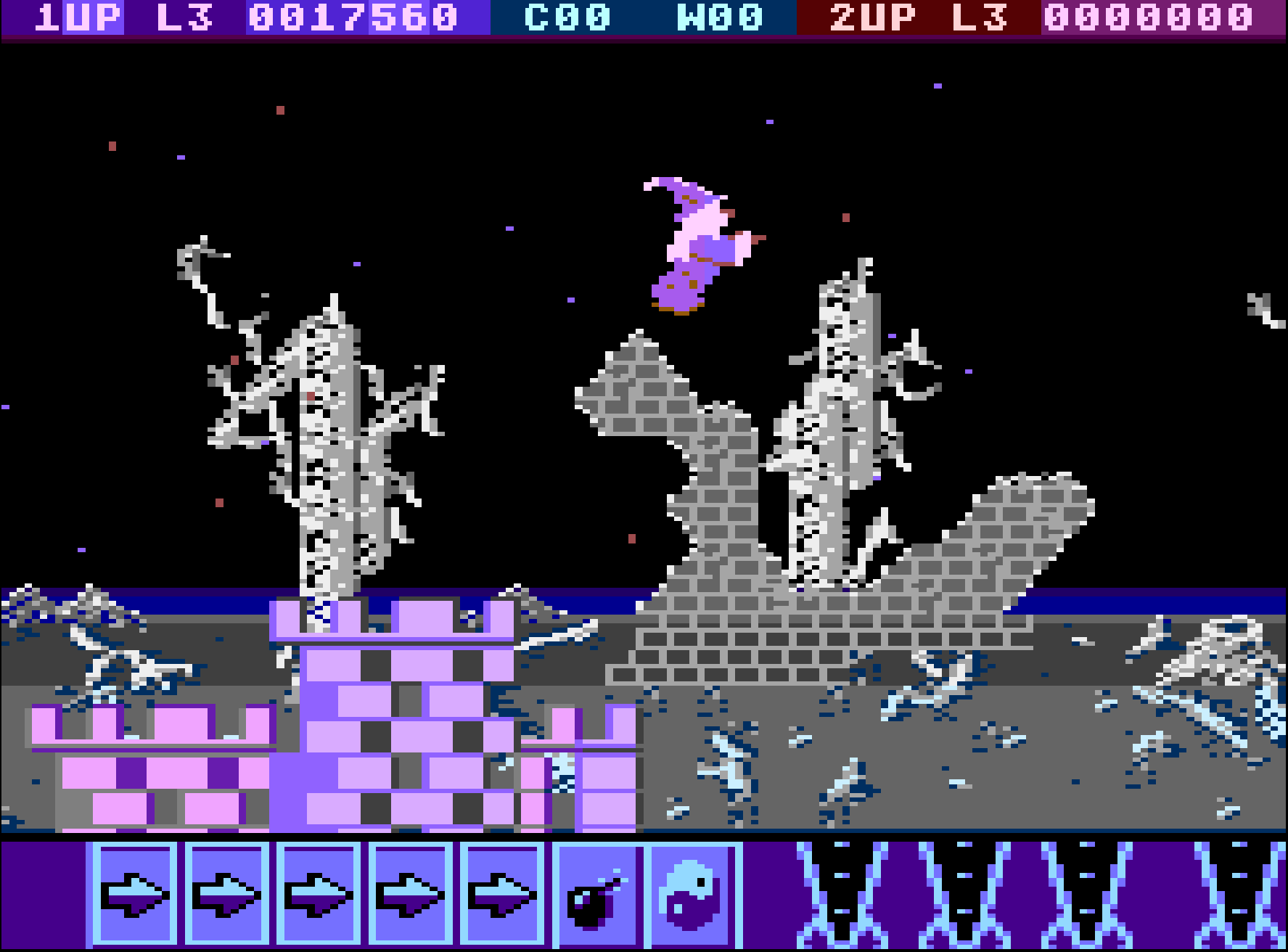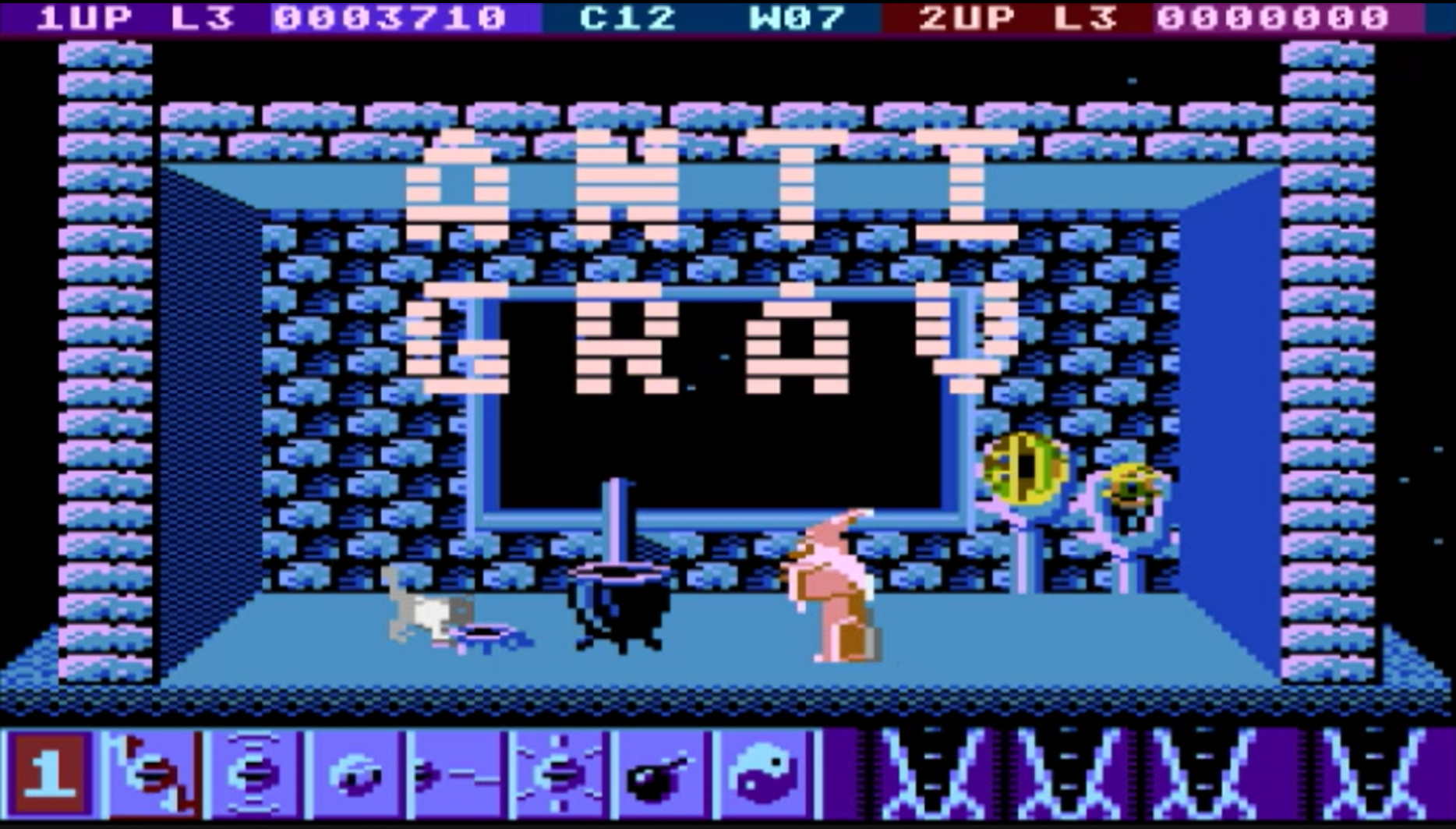 Haus des Zauberers: Durch links/rechts Bewegung und Feuerknopf des Joysticks kann ein permanentes Extra gewählt werden. Diese stehen auch nach Verlust eines Lebens sofort wieder zur Verfügung.