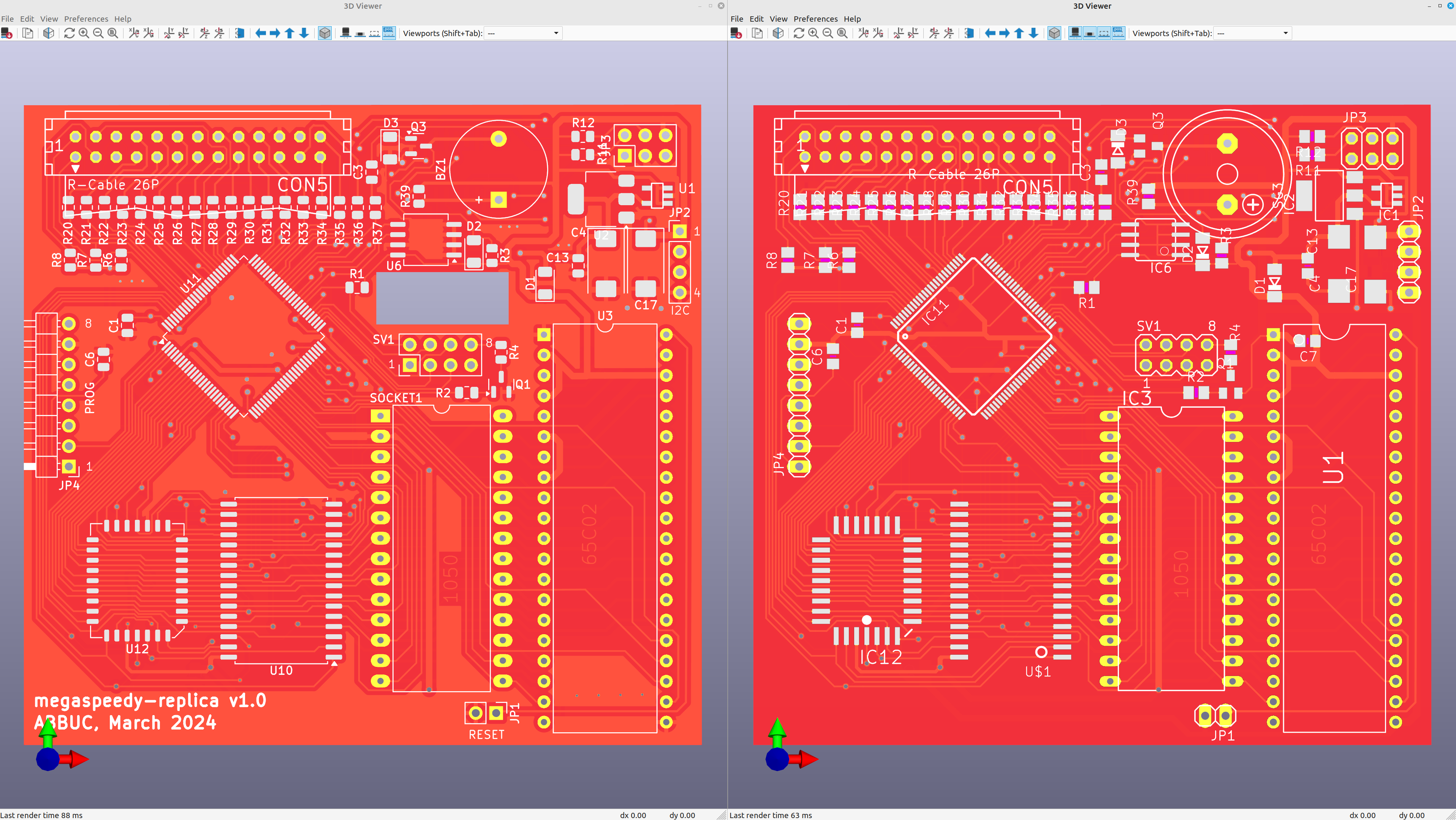 Pretty finished... Looks like the original, but I added a few modifications and rerouted some wires. Changed outlines to be compatible with standard KiCAD, added one capacitor under SRAM... It should be 1:1 compatible with the original PCB as I tried to have almost the same component positions. While working, I found a few minor issues in the schematic and PCB design, but all of them do not affect the main working of MegaSpeedy, so I must say: VERY GOOD WORK guys (MegaHz, Hias, Guus and everyone involved in the project) - this is a beautiful piece of hardware! :-)