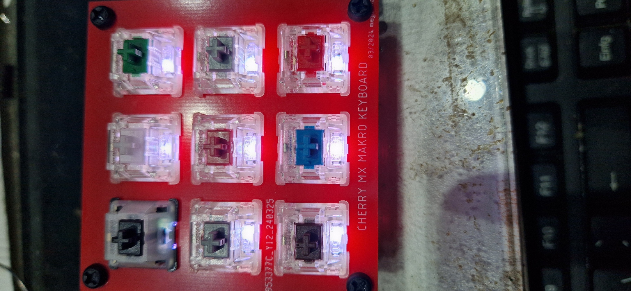 hab ich nun komplett bestückt. D.h. alle Sockel, LEDs, Abdeckplatte und MX Tasten aus dem Probierkit