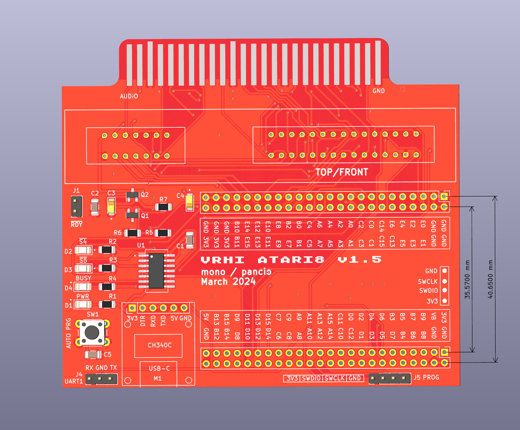 I would like to present my new VRHI device, which is used for programming, reading and cooperation with any Atari XL/XE devices. The main reason why I decided to build it was the need to quickly write to any cartridge, because writing to an Atari takes a very long time... The presented device can do this in a dozen or so seconds (depending on the capacity). Additionally, we can connect any device compatible with Atari to the interface and, if the method of communication is known, we can also control it. We connect VHRI to a PC using a USB cable and, if we need to use a debugger, a serial cable (or another USB). The first tests showed that transmission speeds of 2mbit are possible (reading a 512KB cartridge takes about ~3s), but work is underway to use USB as a faster interface.