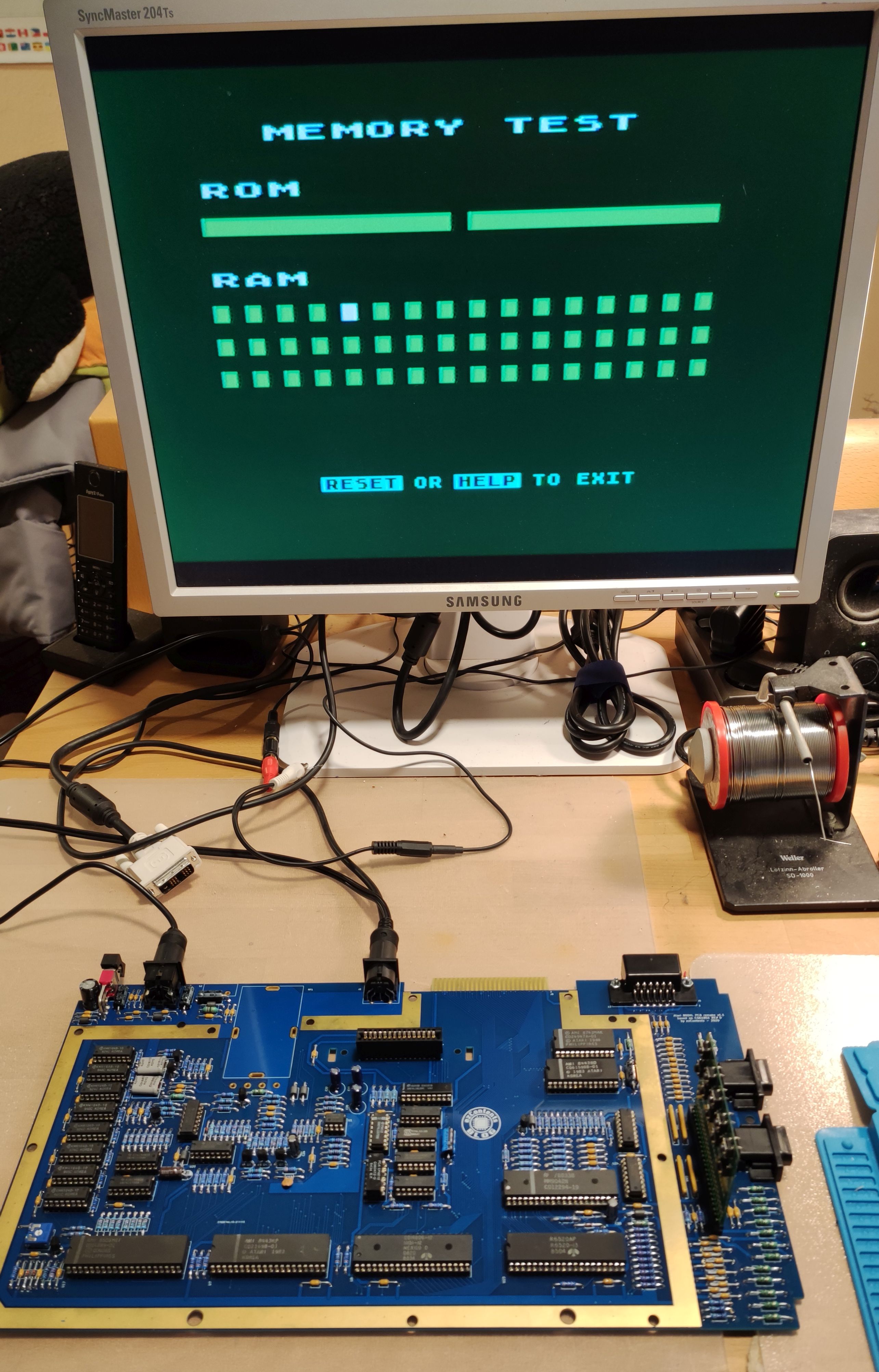 nun die Monitorbuchse -> wenn man es nicht erwarten kann, schon mal alle ICs einsetzen und einschalten! (Hoffentlich kommt ein Ready - falls das Ready kommt, aber der HIntergrund grün anstatt blau ist, dann am Poti nachjustieren. Meist muss er fast ganz auf Anschlag)