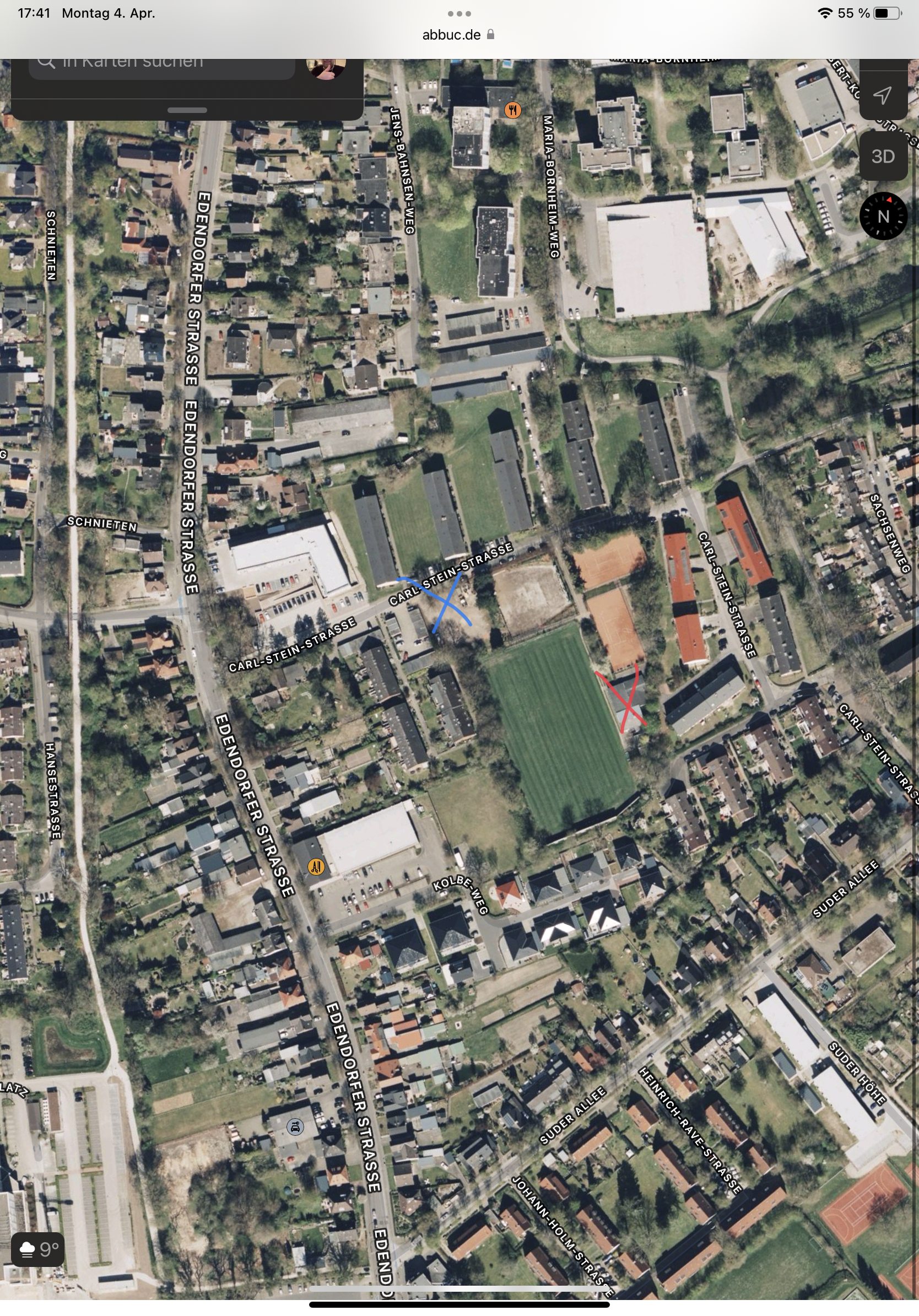 Das blaue X markiert den Parkplatz, das rote X das Vereinsheim.