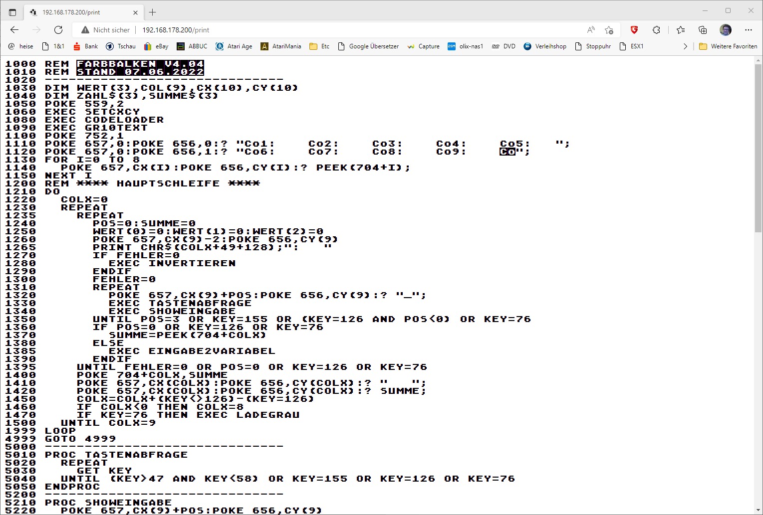 Hier erscheint dann das Listing exakt so wie es der Atari anzeigt, inkl. Sonderzeichen und invertierten Zeichen: