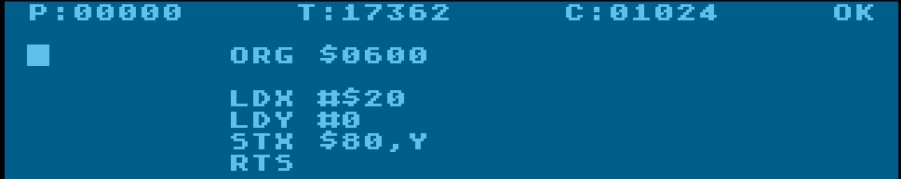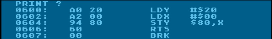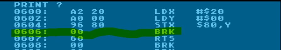 Dummerweise wird dann die letzte 00 dieses falsch überstzten 3 Byte Codes im Programmablauf als BRK interpretiert und mein Programm wird immer an der Stelle beendet und die Steuerung wieder dem Assembler/Monitor übergeben.