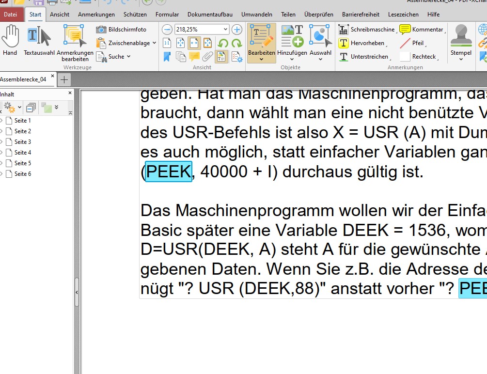 Ich bin der Meinung, dass zur Vermeidung allgemeiner Verwirrung die fetten PEEKs eigentlich DEEKs sein sollten.Selbstverständlich ist es auch möglich, statt einfacher Variablen ganze Ausdrücke einzusetzen, so daß X = USR