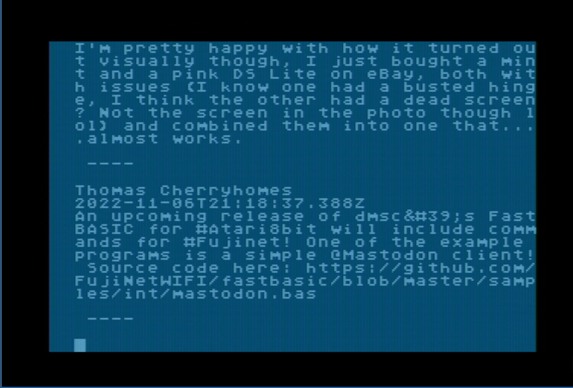 Eine kommende Version von dmsc's FastBASIC für #Atari8bit wird Befehle für #Fujinet enthalten! Eines der Beispielprogramme ist ein einfacher @Mastodon-Client!