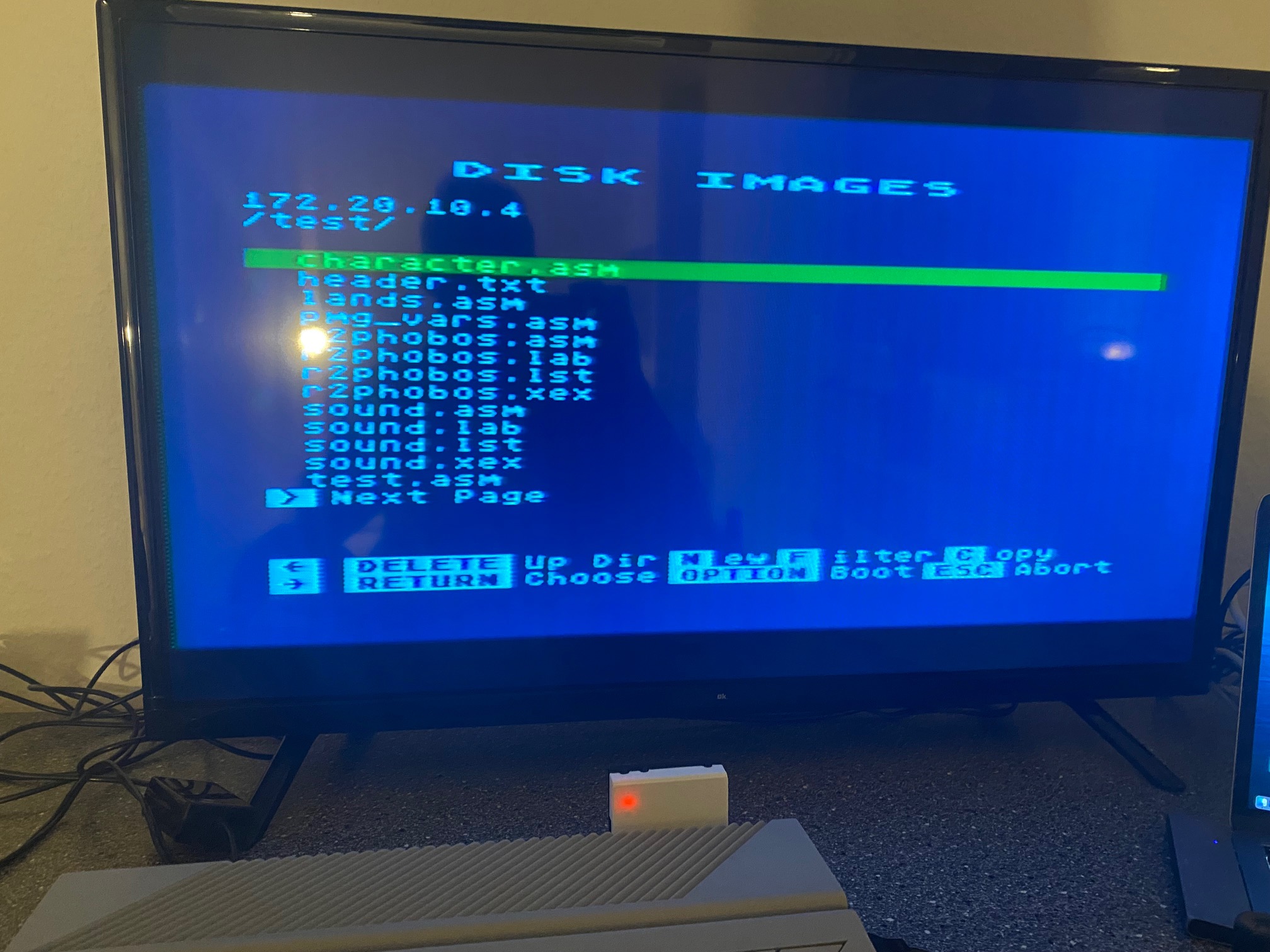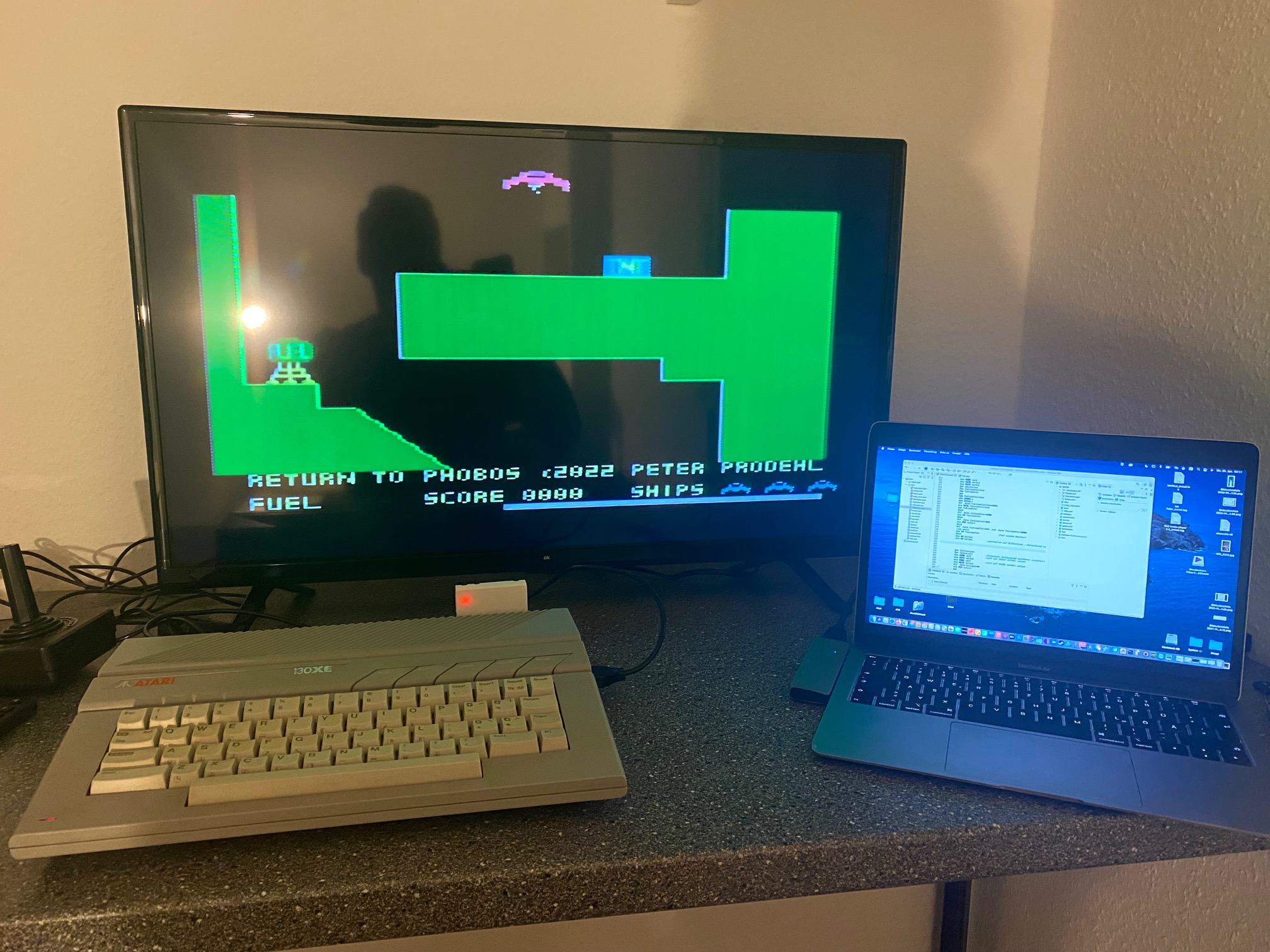 ... die letzten Tage konnte ich endlich meinen Atari-Raum einrichten - noch ist es nicht fertig, aber ich habe schon mal meinen 130 XE aufgebaut, die Fujinet drangehängt, mit meinem Netzwerk verbunden und dann direkt mit meinem Mac das Programm retrun2phobos.xex gestartet... und es läuft. Das war der erste Test meines Programmes auf einem original Atari-Rechner.