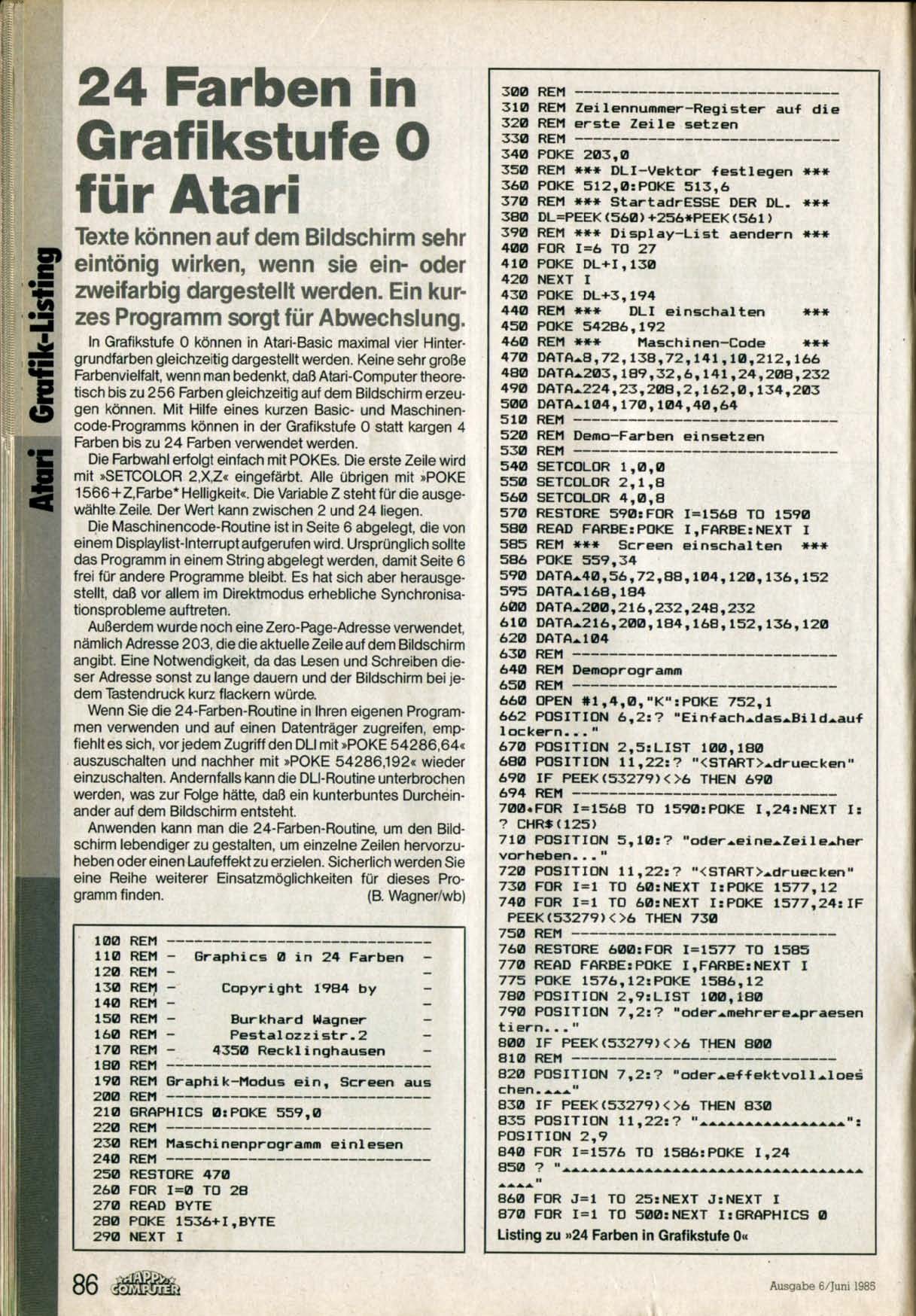 Okay, anstelle der Textdatei (die bei mir irgendwo rumfliegt), hier der Scan der Happy Computer Seite mit dem Listing "24 Farben in Gr. 0" (aus Happy Computer 6-1985). Autor ist Burkhard Wagner, ein Abbucianer...